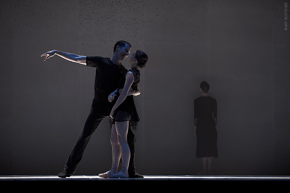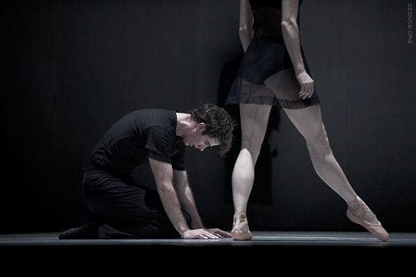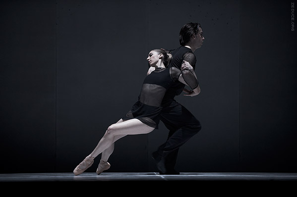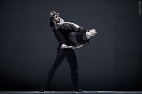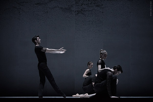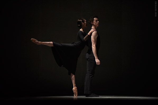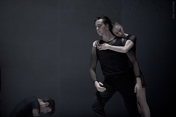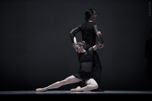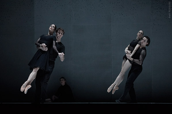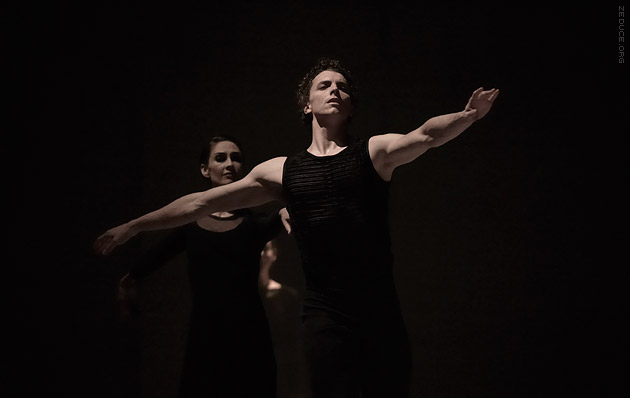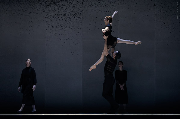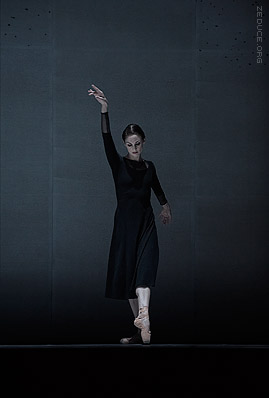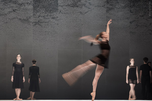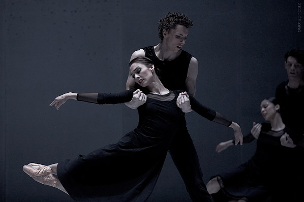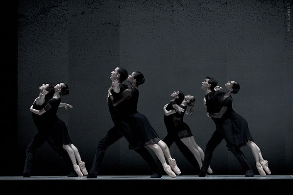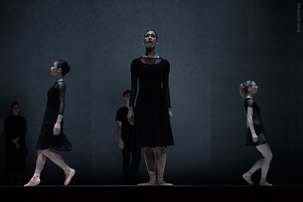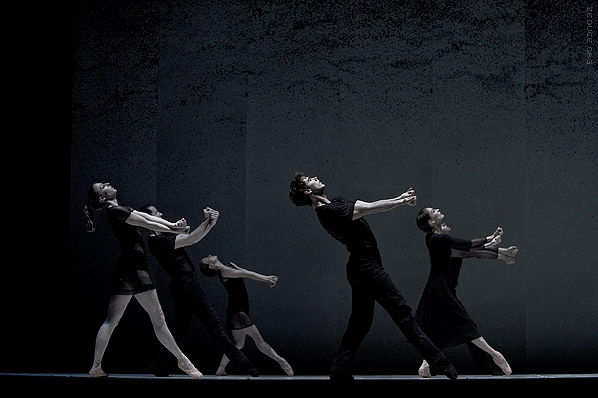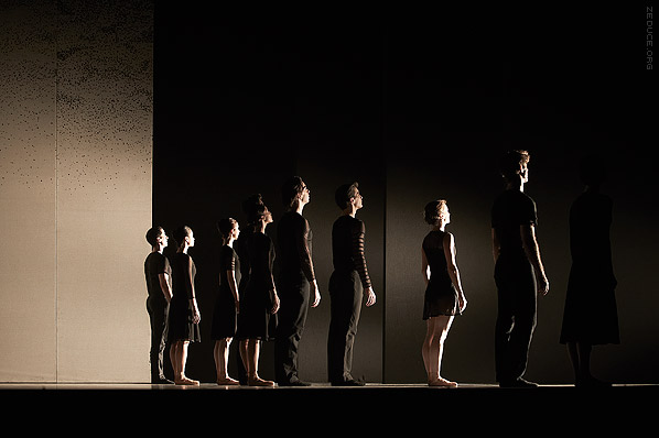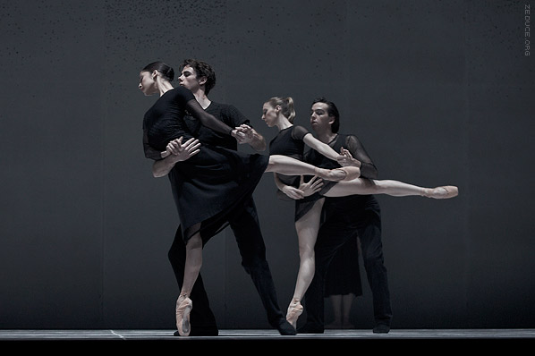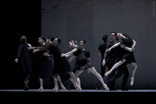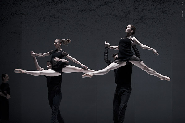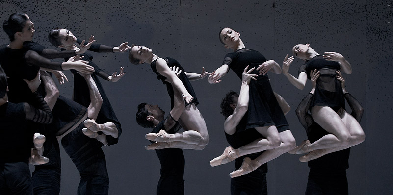 The 26- person Victoria Opera Chorus provided the soundtrack, Richard Robert designed the simplistic yet dynamic set, and Nigel Levings supplied lucid lighting. With the exception of the female dancers’ pink slippers, Anna French designed all black costumes- another nod at the morbid theme. Female dancers donned sheer black sheaths with varying sleeve and skirt lengths, while male dancers were clad in black trousers and tops that also had varying sleeve lengths. |