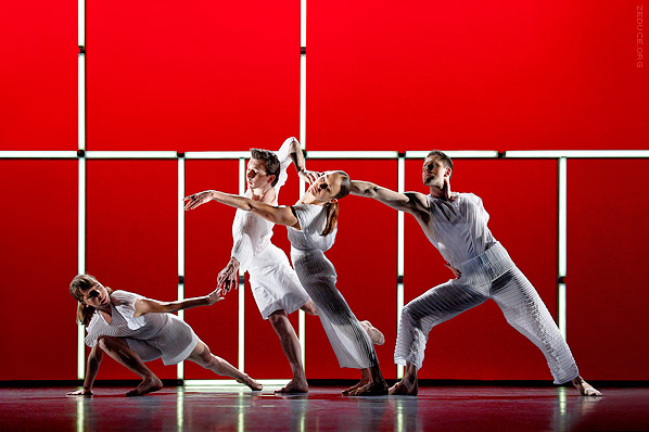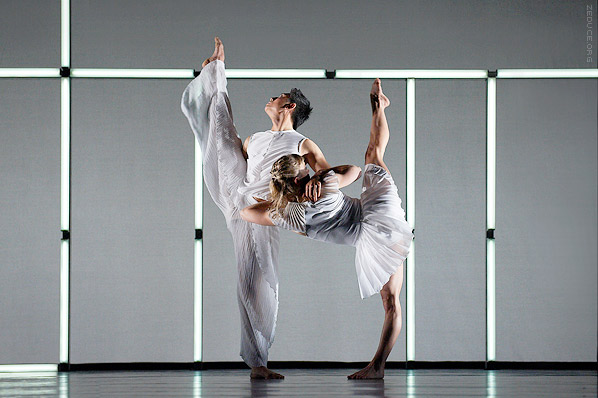As his inspiration, costume designer Theo Clinkard cites the Frankfurt Ballet of the 1980’s. He sought sculptural structure in order to compliment the architectural focus of the production, but shied away from the lycra cloud that typically dominates dance apparel. Clinkard has designed