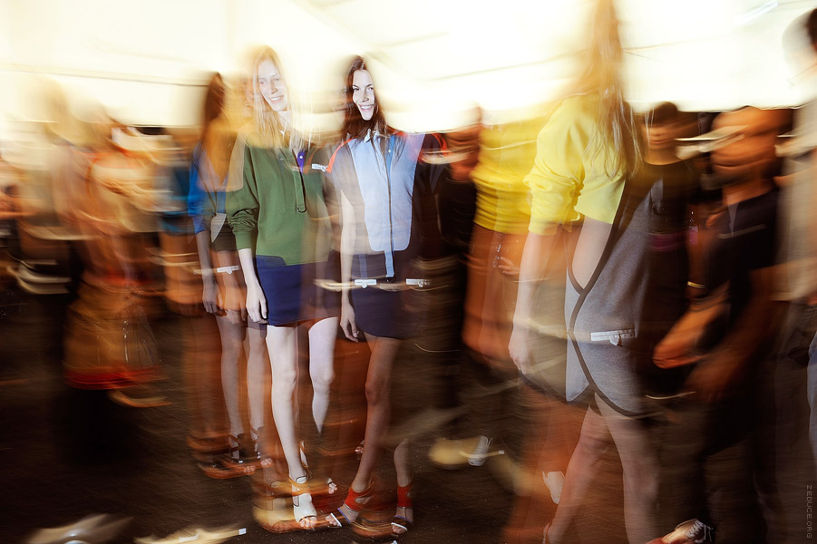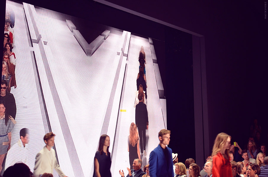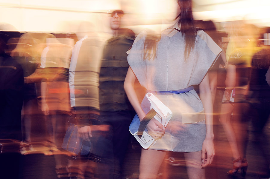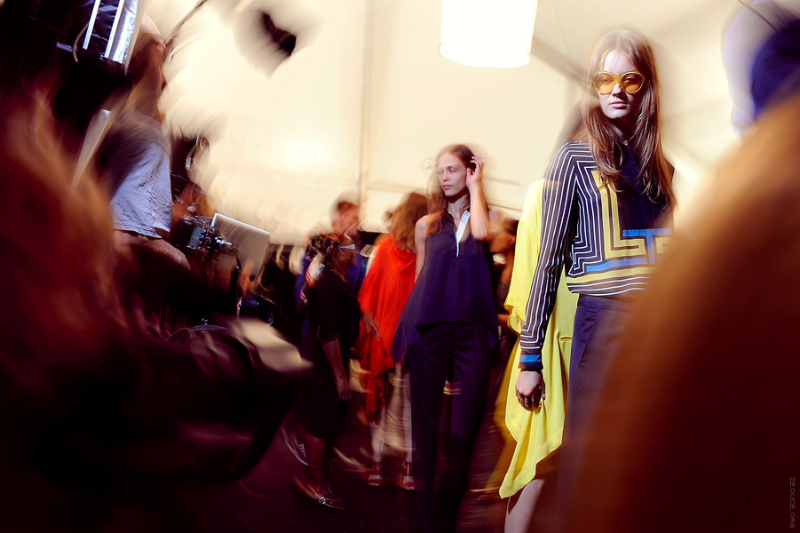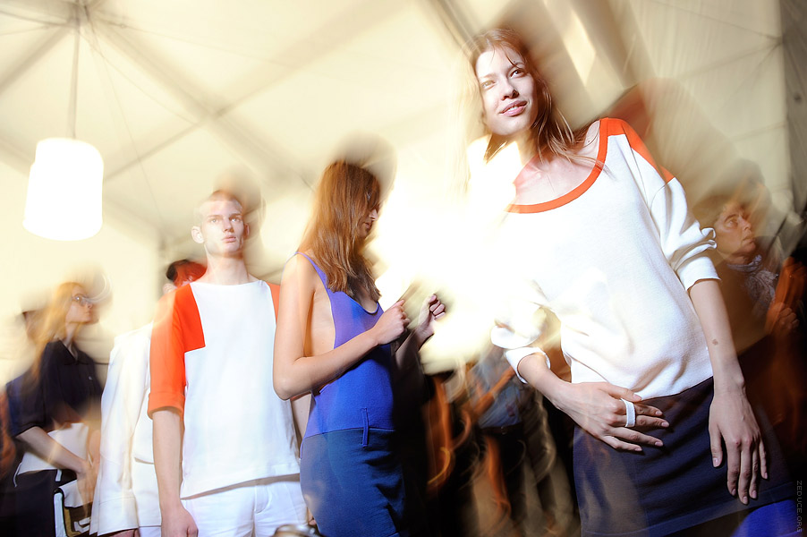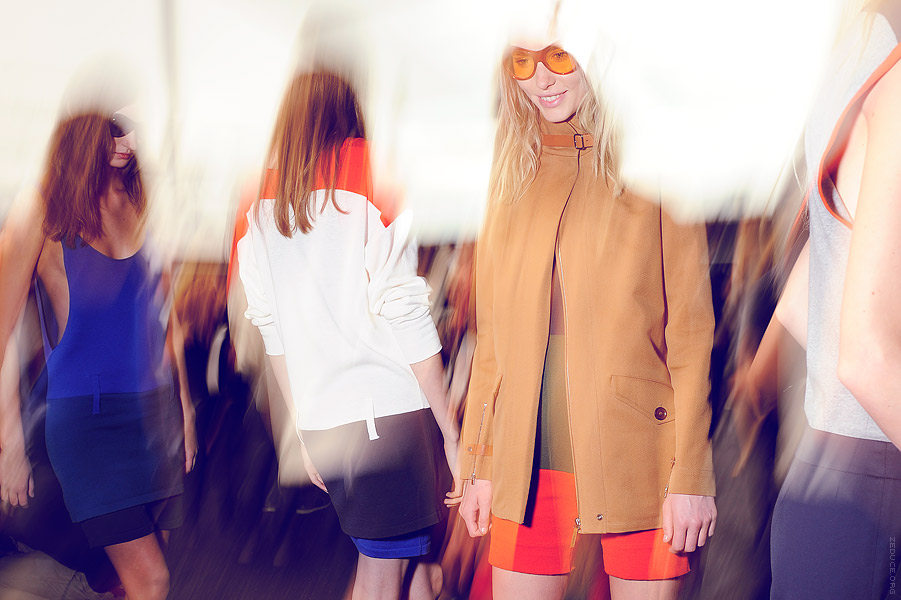 Neutral navy blue, soft grey, beige and caramel are summoned to rival blocks of vibrant Flamenco red, Sumatra blue, Jewel green and Acid yellow. His choice of fabric widely ranges from those nearly liquid, to cotton