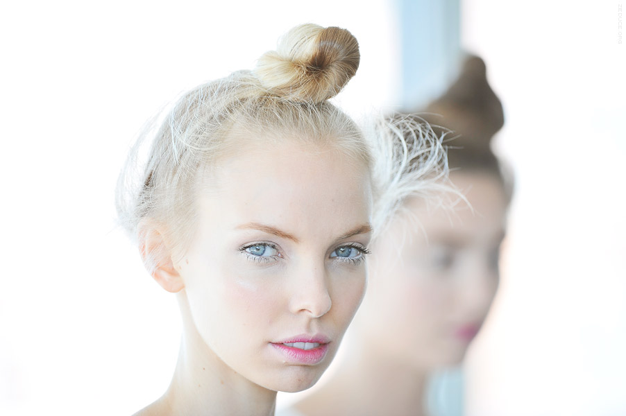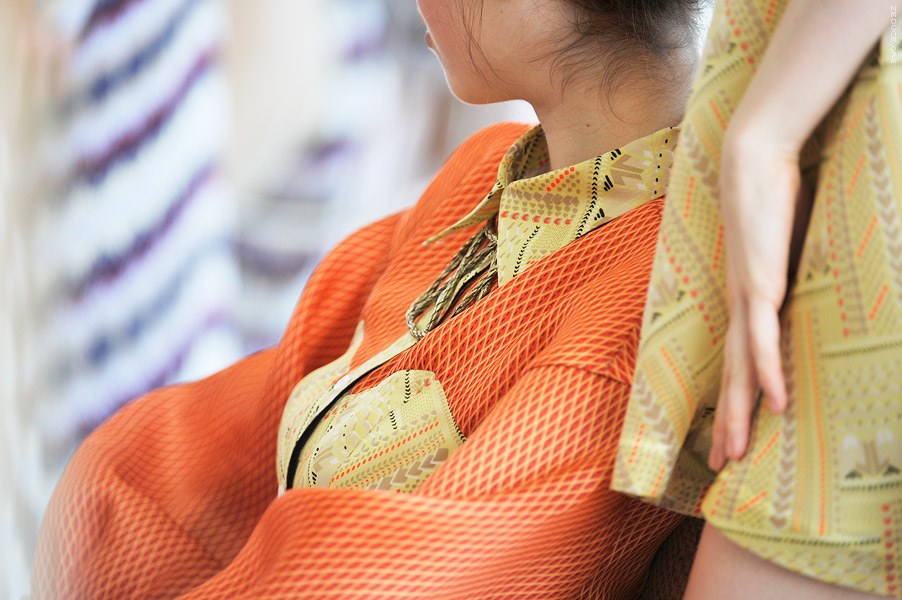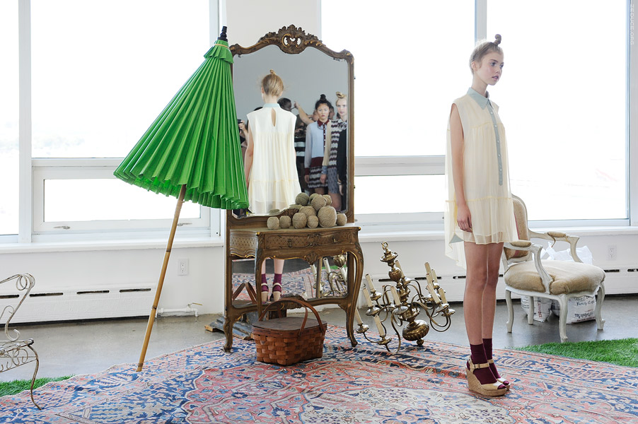 Models were presented in an environment littered with wicker and rusted bird -cages, AstroTurf and soiled Oriental area rugs. Colors of burnt crimson and angelic ivory complimented bamboo and tweed prints. Influence derived from Laotian and Parisian culture created a uniquely peaceful, dignified effect. The collection was largely comprised of dresses with exaggerated bows, pockets, and poplin collars. Skirt lengths half way between mini and maxi, the dresses billowed upon bare knees, with nary