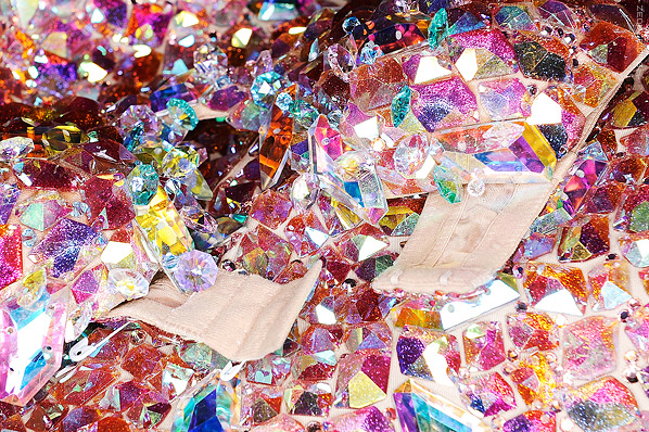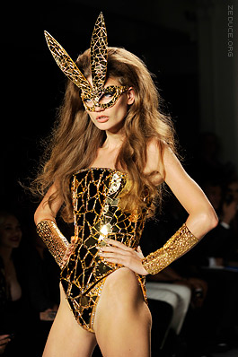 Bodysuits and corsets are riddled with laser cut mirrors, sequins and reflective jewels. Jessica Rabbit is reprised when a red, slinky, bodacious dress is paired with long purple gloves. The following bunny’s torso was peppered with gaping lips, and as she raised her bunny ear mask, you could swear you heard a smack. Fox puff in both black and neon colors dot quartz riddled leotards and thigh-high boots, and ostrich feather fluffs some