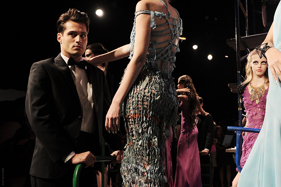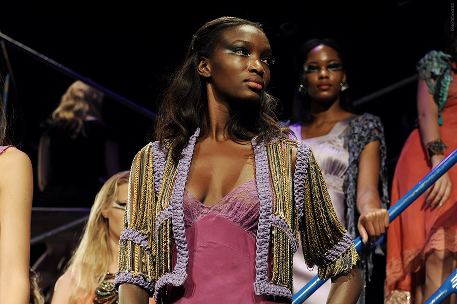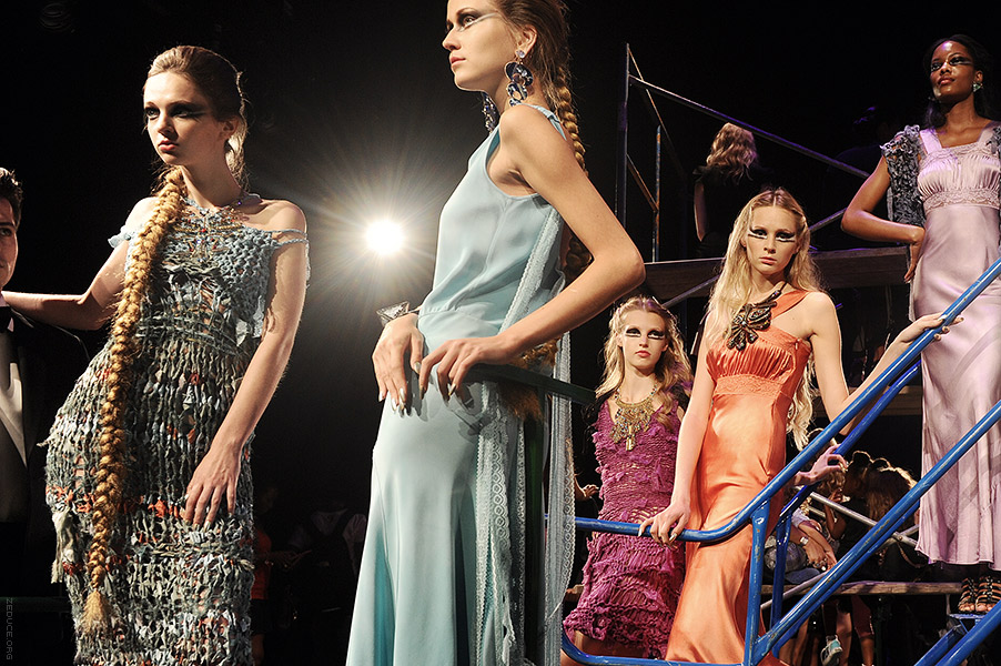 In this display, a central steel-and-wooden scaffolding supports a diverse assortment of ladies arrayed in full glory. Icy doll-like models wearing pastels and jewel tones are juxtaposed with others sporting the iconic little black dress. Evening gowns of bias charmeuse and lace intertwine with web-like large-guage knits, bodices handcrafted primarily of jewels, or boleros made of chains. This season’s collection of jewelry mirrors prismatic light. Bib necklaces with historically ethnic influences