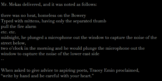 The Artist as Poet.’ The panel included Gerry Bibby, Tracey Emin, Olivier Garbay, Karl Holmqvist, Jonas Mekas and moderator Hans Ulrich Obrist.