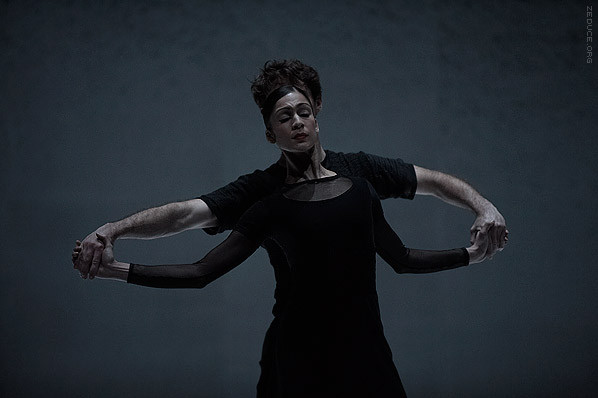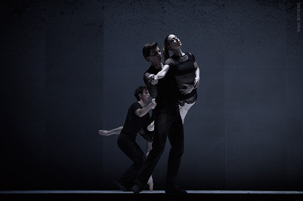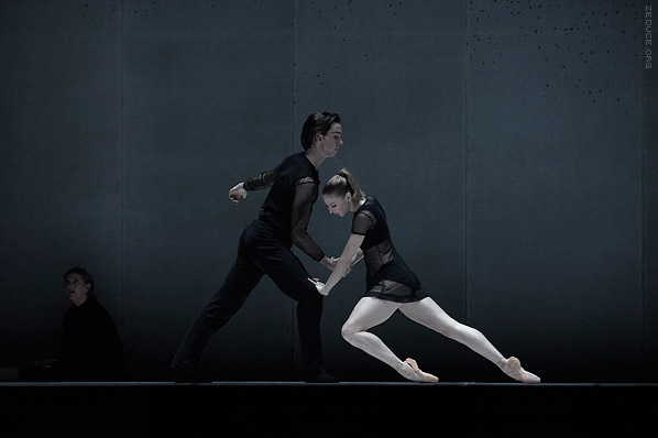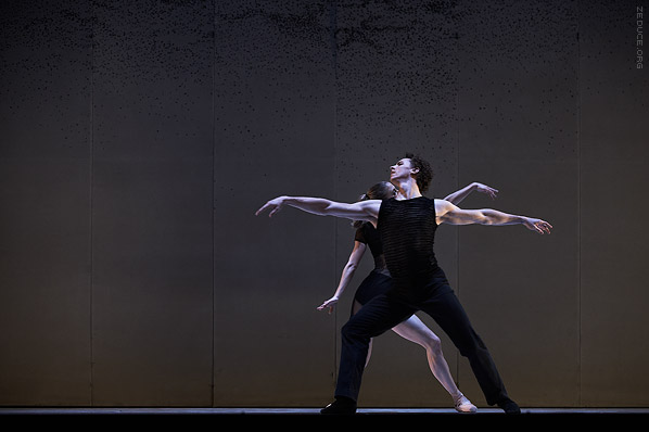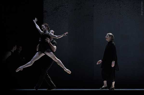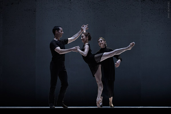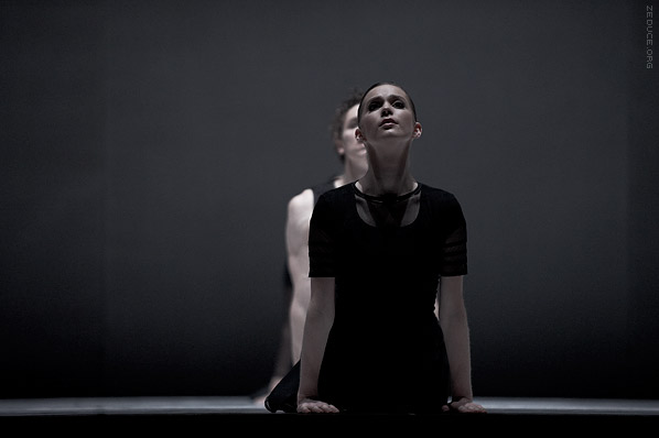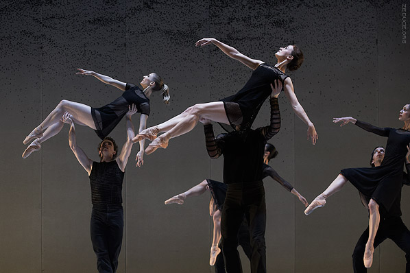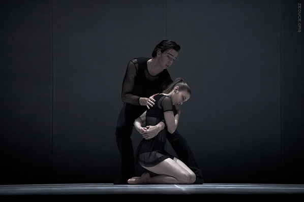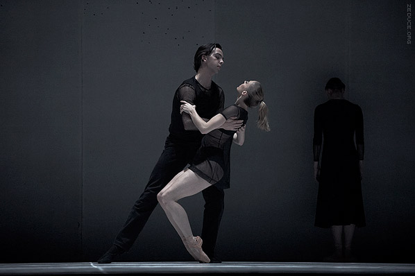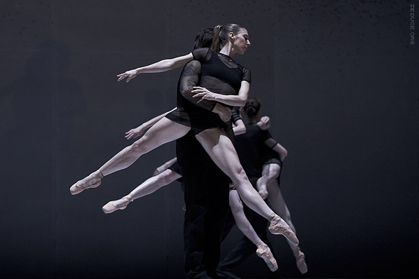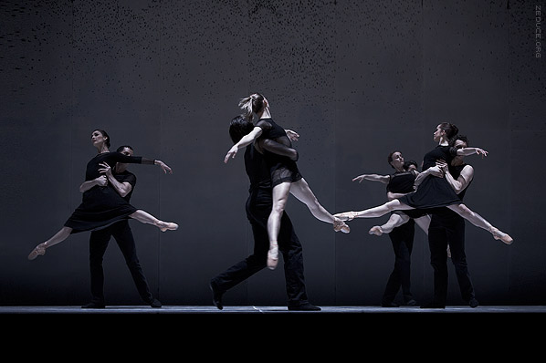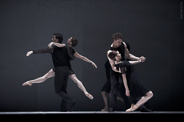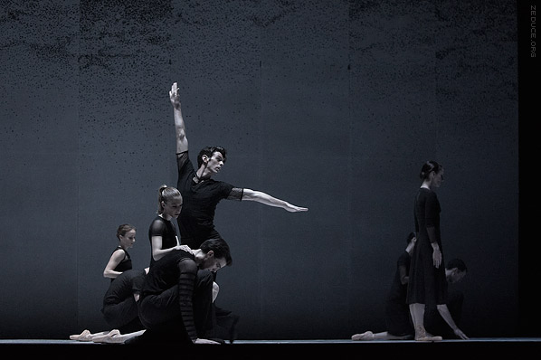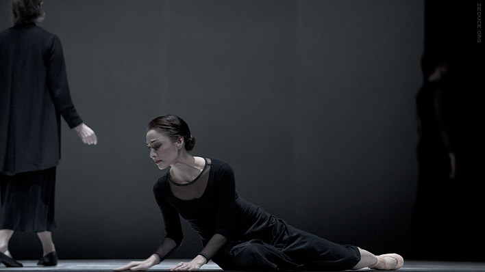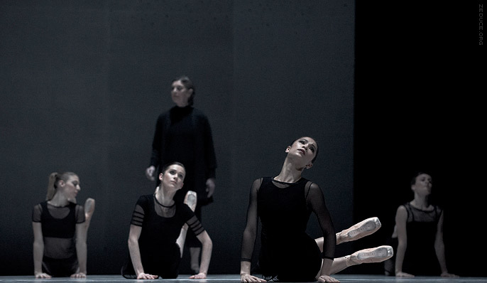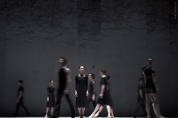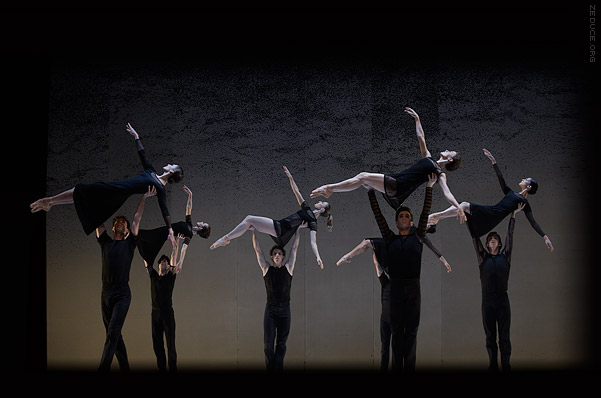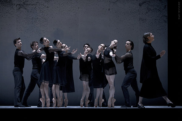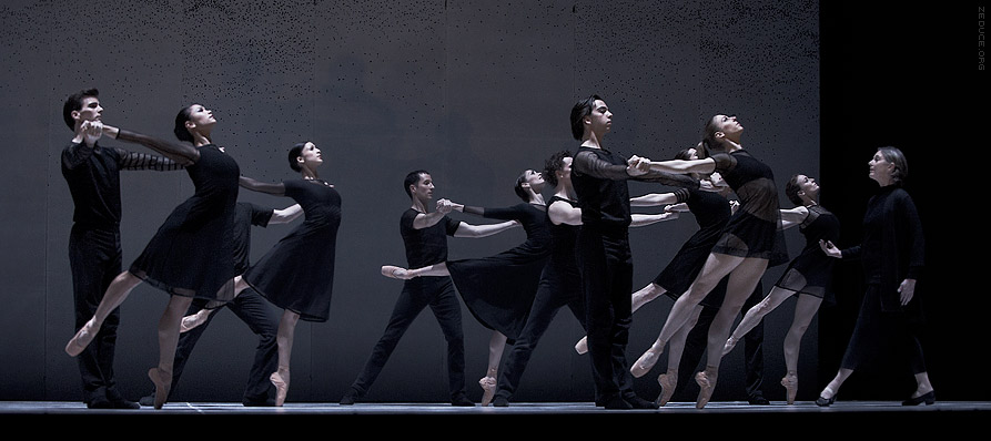 The 26- person Victoria Opera Chorus provided the soundtrack, Richard Robert designed the simplistic yet dynamic set, and Nigel Levings supplied lucid lighting. With the exception of the female dancers’ pink slippers, Anna French designed all black costumes- another nod at the morbid theme. Female dancers donned sheer black sheaths with varying sleeve and skirt lengths, while male dancers were clad in black trousers and tops that also had varying sleeve lengths. |