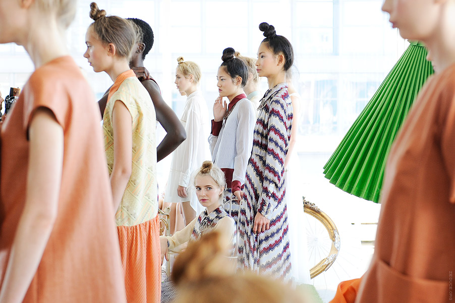 Models were presented in an environment littered with wicker and rusted bird -cages, AstroTurf and soiled Oriental area rugs. Colors of burnt crimson and angelic ivory complimented bamboo and tweed prints. Influence derived from Laotian and Parisian culture created a uniquely peaceful, dignified effect. The collection was largely comprised of dresses with exaggerated bows, pockets, and poplin collars. Skirt lengths half way between mini and maxi, the dresses billowed upon bare knees, with nary