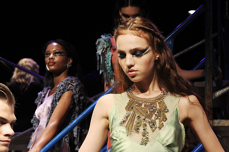 In this display, a central steel-and-wooden scaffolding supports a diverse assortment of ladies arrayed in full glory. Icy doll-like models wearing pastels and jewel tones are juxtaposed with others sporting the iconic little black dress. Evening gowns of bias charmeuse and lace intertwine with web-like large-guage knits, bodices handcrafted primarily of jewels, or boleros made of chains. This season’s collection of jewelry mirrors prismatic light. Bib necklaces with historically ethnic influences