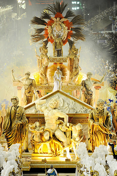 of Carnaval. Scantily clad, vivacious females of 12 distinct Samba schools gyrate atop ornate floats in an exquisite procession.